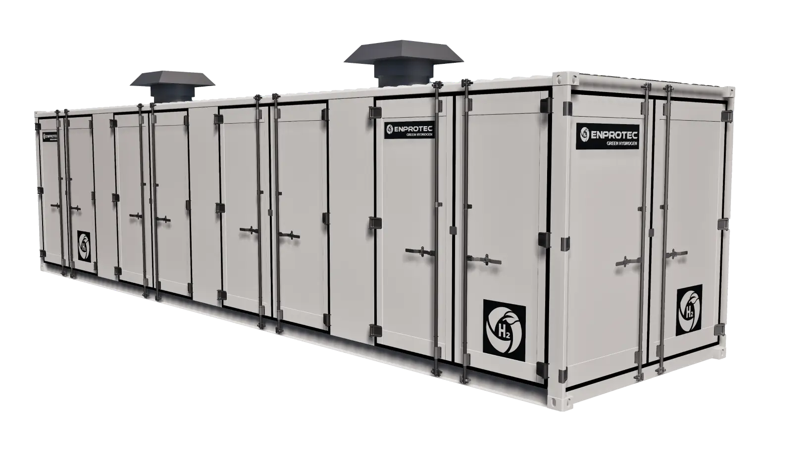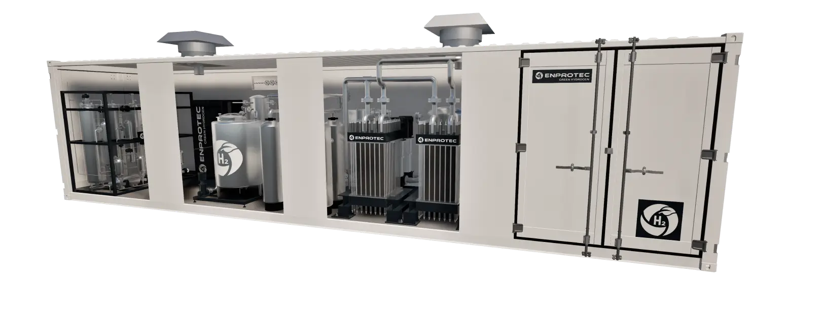 ENPROTEC’s integrated system features two 1 MW PEM stacks engineered for rapid dynamic response. These stacks efficiently adapt to fluctuations in hydrogen demand and variable renewable energy input across a broad modulation range, ensuring optimal performance and reliability in green hydrogen production.